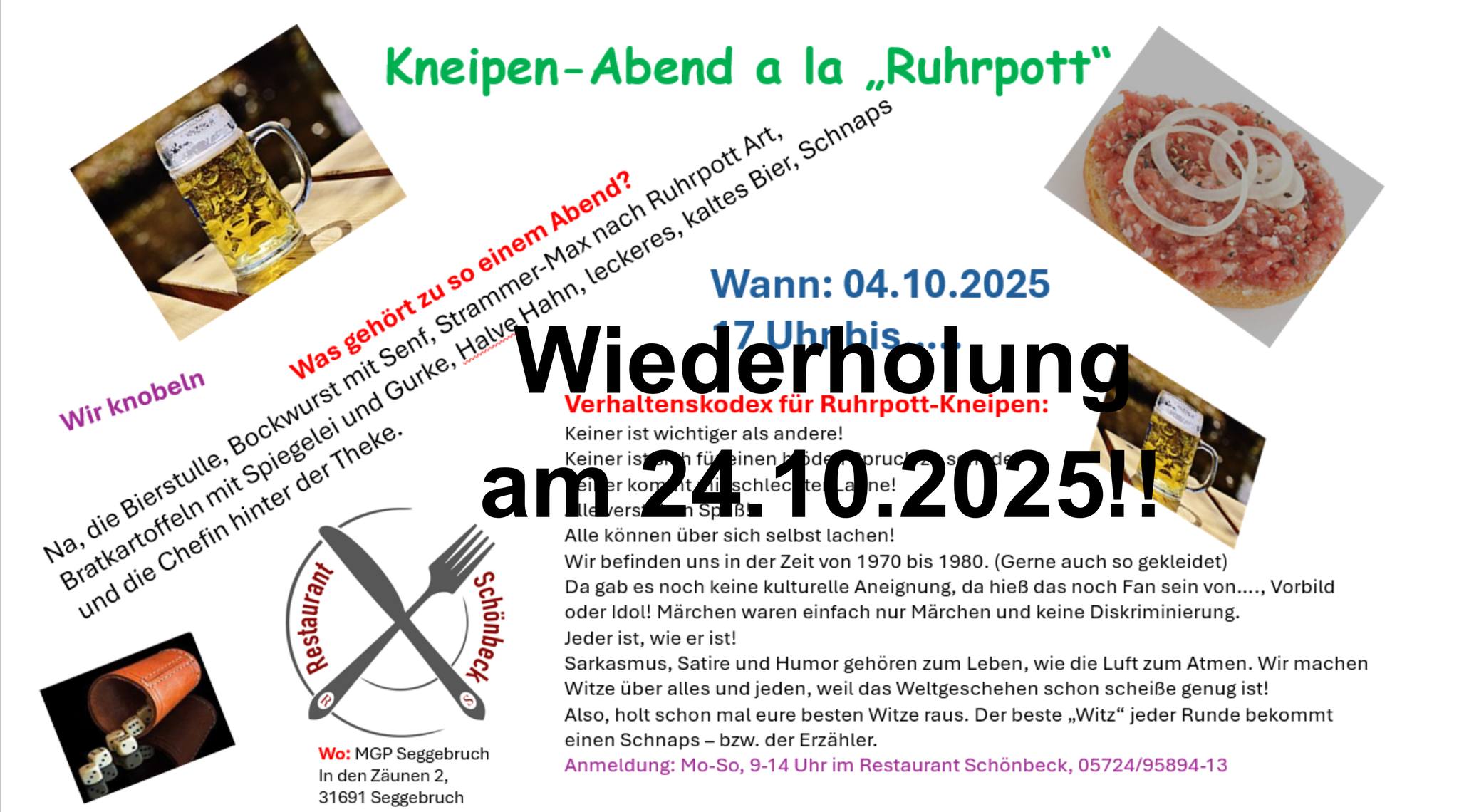 Auf Grund der vielen Nachfragen zum Ruhrpott Kneipen-Abend wiederholen wir die Veranstaltung – natürlich mit all den Köstlichkeiten aus dem Pott!